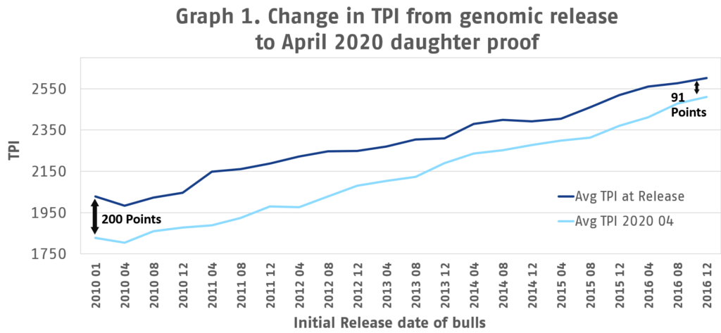 Comme vous pouvez le voir sur le côté gauche du graphique, les taureaux libérés pour la première fois en janvier 2010 ont changé de 200 points d'IPT entre leurs débuts génomiques et leur épreuve de fille d'avril 2020.