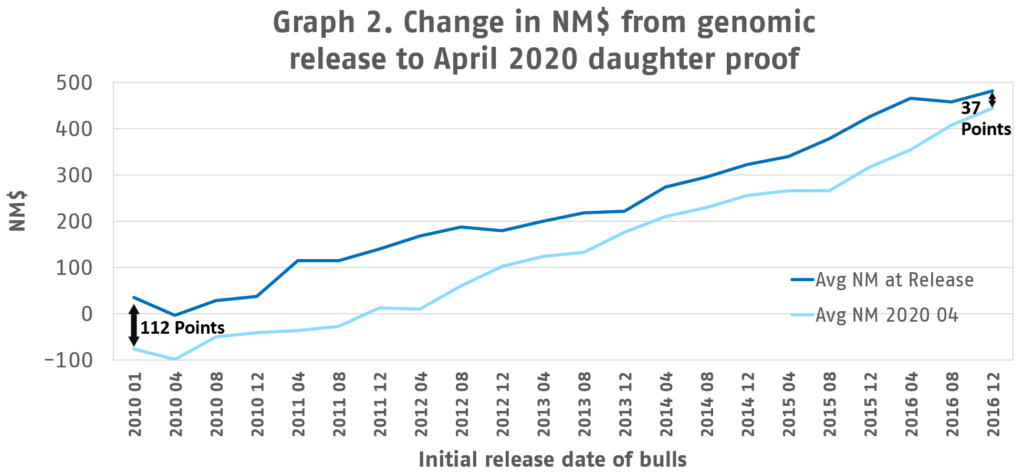 Les taureaux de l'industrie diffusés pour la première fois en tant que taureaux éprouvés par la génomique en janvier 2010 ont chuté, en moyenne, de 112 $NM entre leur première diffusion et leur épreuve de fille d'avril 2020. Par contre, les taureaux les plus récents à obtenir une épreuve de fille - ceux qui ont été diffusés pour la première fois en tant que taureaux génomiques en décembre 2016 - n'ont changé que de 37 NM$ par rapport à leur diffusion initiale.