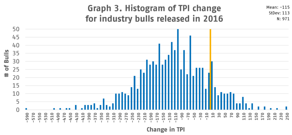 Plus de 140 de ces taureaux ont un IPT prouvé par leur fille à seulement trente points de leur IPT génomique d'origine. Et seulement trente taureaux sur l'ensemble du groupe de 971 ont changé de plus de 300 points d'IPV.