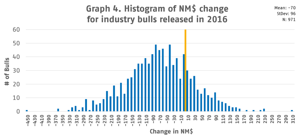 Les graphiques 3 et 4 sont basés sur des données d'épreuves supplémentaires analysées par la généticienne de PEAK, Ashley Mikshowsky. Elle a évalué 971 taureaux de l'industrie diffusés en tant que taureaux éprouvés par la génomique en 2016. Il s'agit de voir la distribution du changement entre l'épreuve génomique et l'épreuve fille - pour l'IPT et le NM$. Elle utilise ce groupe d'âge spécifiquement parce que ces taureaux libérés en 2016 ont maintenant des épreuves de filles pour la production, la santé et les caractères de conformation.