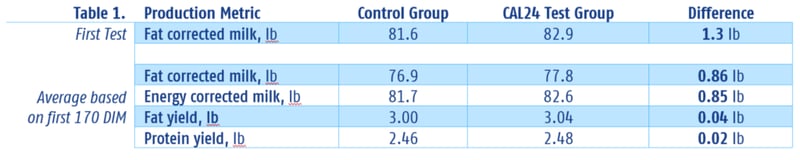 Basée sur le contrôle laitier officiel du jour du test DHIA, cette étude a comparé la production laitière entre le groupe témoin et le groupe test CAL24. Pour ce faire, les scientifiques ont mesuré le rendement laitier du premier jour de contrôle, le lait corrigé en fonction de la matière grasse et les moyennes du lait corrigé en fonction de l'énergie des deux groupes.