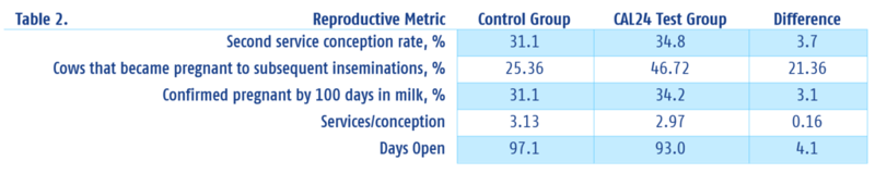 Les taux de conception en première saillie étaient similaires entre les deux groupes d'étude. Comme le montre le tableau 2, les taux de conception en deuxième saillie étaient plus élevés dans le groupe test CAL24. Le pourcentage de vaches du groupe CAL24 qui sont devenues gestantes lors des inséminations suivantes était également plus élevé, ce qui a permis au groupe de test d'avoir plus de vaches confirmées gestantes après 100 jours de lactation, moins de jours moyens d'ouverture et moins de services pour la conception.